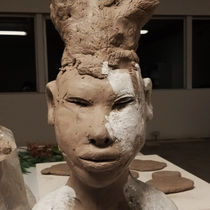 Below: Video still, from artist talk and studio visit with local artists, and six finished heads displayed on the table. Courtesy of Sean Sisson of Last American Media